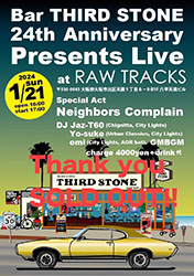 | 21 | 日 | ![]() Bar THIRD STONE 24th Anniversary Neighbors Complain DJ Jaz-T60(Chignitta,City Lights) Yo-suke(Urban Classics,City Lights) emi(City Lights,AOR bot) GMBGM ありがとうございます。 ソールドアウトとなりました。 ▼ご予約は以下メールに(以下記入の上)お願いします。 rawtracks7@gmail.com (当日は整理番号順でのご入場となります) イベントタイトル 1/21 Bar THIRD STONE 24th お名前 お電話番号 ご予約人数 |