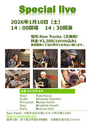 | 28 | 水 | ![]() Cooley High Harmony New Edition 出演:Cooley High Harmony主催:FUNTIME 予約:RAW TRACKS(rawtracks7@gmail.com)12月28日(日)AM10:00より受付 ■ライヴ開催について 緊急事態宣言、蔓延防止等重点措置、営業自粛等によって ライヴ開催を中止、延期、開催時間等の内容変更をやむを得ず行う場合が ございます。 詳細につきましては、アーティスト及びRAW TRACKSのHP等でのお知らせに なりますので、宜しくお願いいたします。 ■お客様へのウィルス対策についてのお願いとお知らせ ・万が一、発熱・咳・全身痛などの症状がある場合、ライヴの参加は ご遠慮ください。 ・入口にて消毒用アルコールを設置しておりますので、ご入場の際及び適宜 ご使用ください。 ・マスクの着用はお客様の任意でご入場ください。 ・ご入場時、入口にて検温を行います。 ・密集した空間を作らないように、定員を決めお客様同士の距離を取らせていただ きます。 ・開演時以外はすべての扉を開放し、換気ができるよう状態にいたします。 熱中症なども考えられますので、水分補給などの対応をお願いいたします。 ・ソーシャルディスタンスを守り、行動をお願いいたします。 ご来場の皆様、アーティスト、ライヴハウスすべてが守られる環境づくりのため、 ご協力の程、宜しくお願いいたします。 |