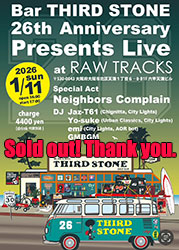 | 11 | 日 | ![]() Bar THIRD STONE 26th Anniversary ありがとうございます。 Special Act Neighbors Complain DJ Jaz-T62(Chignitta,City Lights) Yo-suke(Urban Classics,City Lights) emi(City Lights,AOR bot) GMBGM ▼予約開始は9/10 (水)12:00から受付となります。 以下メールアドレスからお願い致します。 ▼ご予約は以下記入でメールでお願い致します。 予約メール rawtracks7@gmail.com 件名に 1/11 THIRD STONE26th お名前、ご予約人数、お電話番号を記入して送って下さい。 |