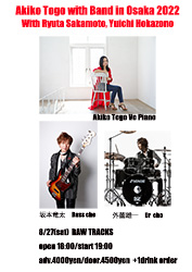 | 27 | 土 | ![]() Akiko Togo with Band in Osaka 2022 Akiko Togo Vo Piano 坂本竜太 Bass cho 外薗雄一 Dr cho 予約受付 6月3日(金)16時からになります。 予約はメールでお願い致します。 予約メールアドレス rawtracks7@gmail.com ≪ 予約時必要記入事項 ≫ 1.ライヴ日時・公演名 2.予約人数 3.代表者のお名前(ひらがな入力)・住所・連絡先 |