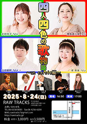 | 24 | 日 | ![]() 四人四色の歌物語 北村尚子(vo) 豊島真沙美(vo) 山中敏幹(vo) 梁善美(vo) 大西隆裕(g) 西尾Bun博文(b) 小林徹(key) 畑啓介(d) 織谷ひろこ(per) |